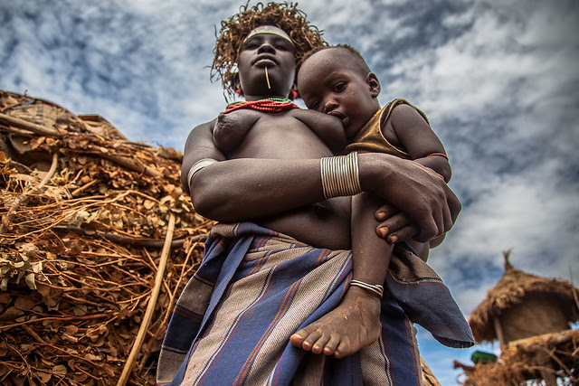 A Dassanech mother and child standing in front of the granary. | © Frans Devriese