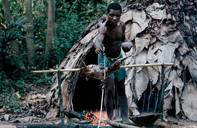 Over the course of a year the Aka spend about 56 percent of their time hunting, 27 percent of their time gathering, and 17 percent of their time in village work for the Ngandu (Bahuchet 1988). The relative importance of hunting and gathering activities fluctuates from season to season. It is estimated, for example, that the Aka spend up to 90 percent of their time net hunting in the drier season (January to May), while during part of the rainy season (August to September) 60 percent of their time is spent collecting food, especially caterpillars (Bahuchet 1988). Much of the vegetable food in the Aka diet is obtained by trading meat to farmers for manioc and other cultigens. Although the Aka net hunt in the forest the majority of the year and spend little or no time cultivating plant foods, they are transitional foragers in the sense that a large proportion of their diet comes from these domesticated village products. Seldom does a day go by without some of this food being eaten. While residing part of the year near the Ngandu village, Aka provide labor to their village konza (patron) for which they receive access to the farmer's fields. The Aka come to the village three or four months a year to assist in the clearing of the fields. A "typical" Aka meal in the dry season in a forest camp would consist of manioc, meat from a blue duiker cooked in a payo gravy, and shredded koko leaves (Gnetum SPP.).